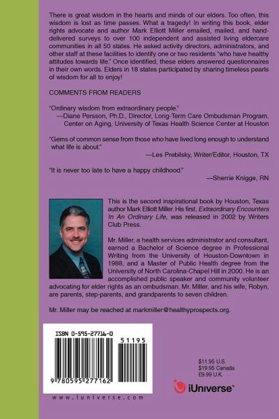 There is great wisdom in the hearts and minds of our elders. Too often, this wisdom is lost as time passes. What a tragedy! In writing this book, elder rights advocate and author Mark Elliott Miller emailed, mailed, and hand-delivered surveys to over 100 independent and assisted living eldercare communities in all 50 states. He asked activity directors, administrators, and other staff at these facilities to identify one or two residents "who have healthy attitudes towards life." Once identified, these elders answered questionnaires in their own words. Elders in 18 states participated by sharing timeless pearls of wisdom for all to enjoy! COMMENTS FROM READERS "Ordinary wisdom from extraordinary people."--Diane Persson, Ph.D., Director, Long-Term Care Ombudsman Program, Center on Aging, University of Texas Health Science Center at Houston "Gems of common sense from those who have lived long enough to understand what life is about."--Les Prebilsky, Writer/Editor, Houston, TX "It is never too late to have a happy childhood."--Sherrie Knigge, RN