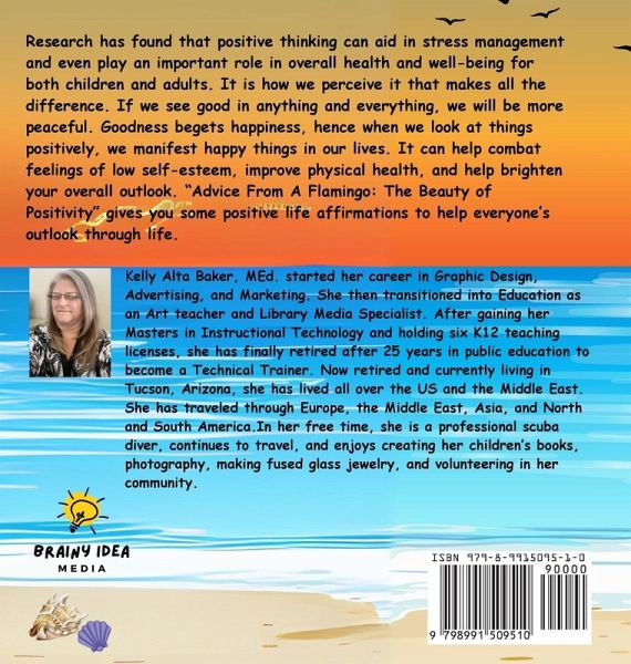Research has found that positive thinking can aid in stress management and even play an important role in overall health and well-being for both children and adults. It is how we perceive it that makes all the difference. If we see good in anything and everything, we will be more peaceful. Goodness begets happiness, hence when we look at things positively, we manifest happy things in our lives. It can help combat feelings of low self-esteem, improve physical health, and help brighten your overall outlook. "Advice From A Flamingo: The Beauty of Positivity" gives you some positive life affirmations to help everyone's outlook through life.…mehr