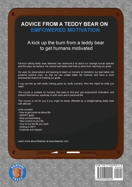 Famous talking teddy bear, Bearsac has observed a lot about our strange human species and the ways we behave. He notices bad habits that hold us back from reaching our goals. He uses his observations and learning to teach us humans to transform our bad habits into powerful positive ones, so that we can create better life chances and have a more empowered chance of meeting our goals. If you are fed up with stuffy training given by stuffy humans, then this might be what you need! The course is suitable for humans that need to find and use empowered motivation, and present themselves, positively in both work and in personal life. This course is not for you if you might be easily offended by a straight-talking teddy bear with attitude! Units covered - How to get juiced up about life - SMART goals - Stop procrastinating - Take control of your life - How to live the life you want - Getting to WHY - Gratitude and respect
