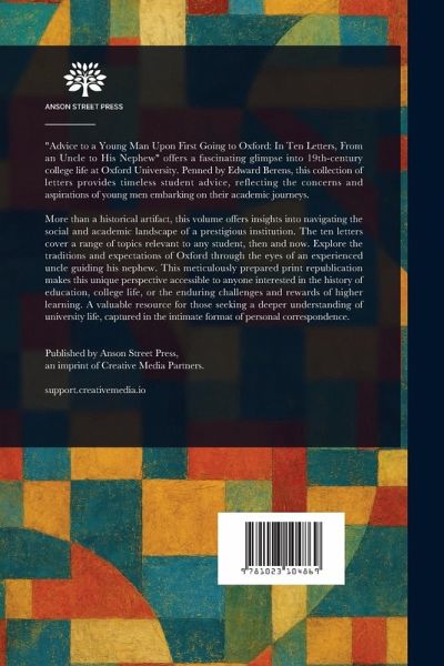 "Advice to a Young Man Upon First Going to Oxford: In Ten Letters, From an Uncle to His Nephew" offers a fascinating glimpse into 19th-century college life at Oxford University. Penned by Edward Berens, this collection of letters provides timeless student advice, reflecting the concerns and aspirations of young men embarking on their academic journeys. More than a historical artifact, this volume offers insights into navigating the social and academic landscape of a prestigious institution. The ten letters cover a range of topics relevant to any student, then and now. Explore the traditions and expectations of Oxford through the eyes of an experienced uncle guiding his nephew. This meticulously prepared print republication makes this unique perspective accessible to anyone interested in the history of education, college life, or the enduring challenges and rewards of higher learning. A valuable resource for those seeking a deeper understanding of university life, captured in the intimate format of personal correspondence. This work has been selected by scholars as being culturally important, and is part of the knowledge base of civilization as we know it. This work is in the public domain in the United States of America, and possibly other nations. Within the United States, you may freely copy and distribute this work, as no entity (individual or corporate) has a copyright on the body of the work. Scholars believe, and we concur, that this work is important enough to be preserved, reproduced, and made generally available to the public. We appreciate your support of the preservation process, and thank you for being an important part of keeping this knowledge alive and relevant.