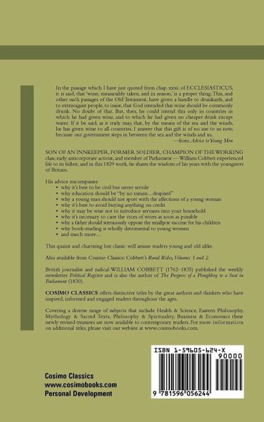In the passage which I have just quoted from chap. xxxi. of ECCLESIASTICUS, it is said, that 'wine, measurably taken, and in season,' is a proper thing. This, and other such passages of the Old Testament, have given a handle to drunkards, and to extravagant people, to insist, that God intended that wine should be commonly drunk. No doubt of that. But, then, he could intend this only in countries in which he had given wine, and to which he had given no cheaper drink except water. If it be said, as it truly may, that, by the means of the sea and the winds, he has given wine to all countries, I answer that this gift is of no use to us now, because our government steps in between the sea and the winds and us. -from Advice to Young Men Son of an innkeeper, former soldier, champion of the working class, early anticorporate activist, and member of Parliament-William Cobbett experienced life to its fullest, and in this 1829 work, he shares the wisdom of his years with the youngsters of Britain. His advice encompasses: . why it's best to be civil but never servile . why education should be "by no means... despised" . why a young man should not sport with the affections of a young woman . why it's best to avoid buying anything on credit . why it may be wise not to introduce servants into your household . why it's necessary to cure the vices of wives as soon as possible . why a father should strenuously oppose the smallpox vaccine for his children . why book-reading is wholly detrimental to young women . and much more. This quaint and charming lost classic will amuse readers young and old alike. Also available from Cosimo Classics: Cobbett's Rural Rides, Volumes 1 and 2. British journalist and radical WILLIAM COBBETT (1762-1835) published the weekly newsletter Political Register and is also the author of The Progress of a Ploughboy to a Seat in Parliament (1830).