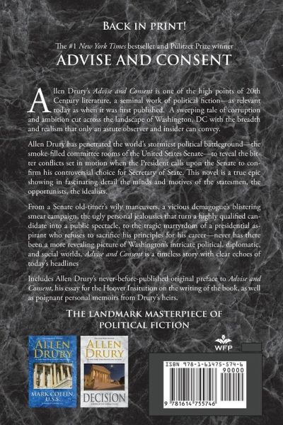 The #1 New York Times bestseller and Pulitzer Prize winner Allen Drury's Advise and Consent is one of the high points of 20th Century literature, a seminal work of political fiction-as relevant today as when it was first published. A sweeping tale of corruption and ambition cuts across the landscape of Washington, DC, with the breadth and realism that only an astute observer and insider can convey. Allen Drury has penetrated the world's stormiest political battleground-the smoke-filled committee rooms of the United States Senate-to reveal the bitter conflicts set in motion when the President calls upon the Senate to confirm his controversial choice for Secretary of State. This novel is a true epic showing in fascinating detail the minds and motives of the statesmen, the opportunists, the idealists. From a Senate old-timer's wily maneuvers, a vicious demagogue's blistering smear campaign, the ugly personal jealousies that turn a highly qualified candidate into a public spectacle, to the tragic martyrdom of a presidential aspirant who refuses to sacrifice his principles for his career-never has there been a more revealing picture of Washington's intricate political, diplomatic, and social worlds. Advise and Consent is a timeless story with clear echoes of today's headlines. Includes Allen Drury's never-before-published original preface to Advise and Consent, his essay for the Hoover Institution on the writing of the book, as well as poignant personal memoirs from Drury's heirs.