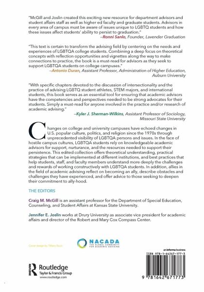 Co-published with NACADA. This collection offers theoretical understanding of the literature of the field, practical strategies that can be implemented at different institutions, and best practices that helps students, staff, and faculty members understand more deeply the challenges and rewards of working with LGBTQA students.