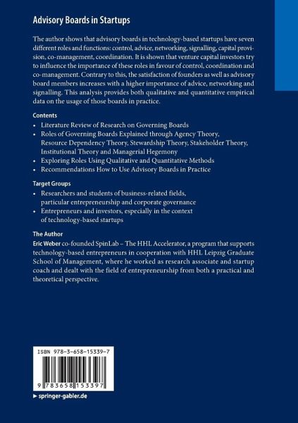 The author shows that advisory boards in technology-based startups have seven different roles and functions: control, advice, networking, signalling, capital provision, co-management, coordination. It is shown that venture capital investors try to influence the importance of these roles in favour of control, coordination and co-management. Contrary to this, the satisfaction of founders as well as advisory board members increases with a higher importance of advice, networking and signalling. This analysis provides both qualitative and quantitative empirical data on the usage of those boards in practice.