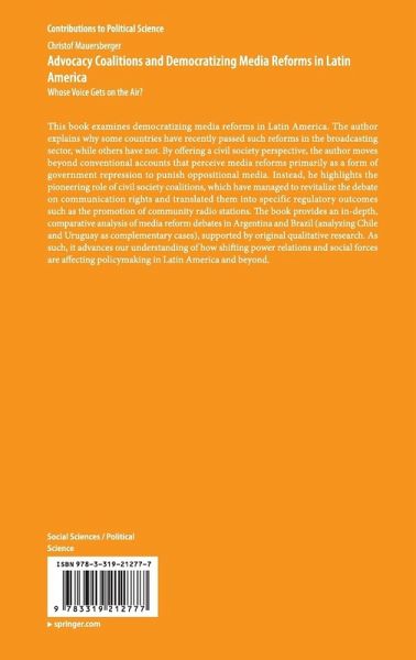 This book examines democratizing media reforms in Latin America. The author explains why some countries have recently passed such reforms in the broadcasting sector, while others have not. By offering a civil society perspective, the author moves beyond conventional accounts that perceive media reforms primarily as a form of government repression to punish oppositional media. Instead, he highlights the pioneering role of civil society coalitions, which have managed to revitalize the debate on communication rights and translated them into specific regulatory outcomes such as the promotion of community radio stations. The book provides an in-depth, comparative analysis of media reform debates in Argentina and Brazil (analyzing Chile and Uruguay as complementary cases), supported by original qualitative research. As such, it advances our understanding of how shifting power relations and social forces are affecting policymaking in Latin America and beyond.