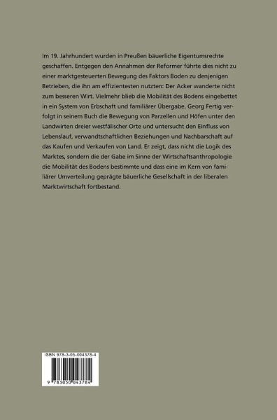 Im 19. Jahrhundert wurden in Preußen bäuerliche Eigentumsrechte geschaffen. Entgegen den Annahmen der Reformer führte dies nicht zu einer marktgesteuerten Bewegung des Faktors Boden zu denjenigen Betrieben, die ihn am effizientesten nutzten: Der Acker wanderte nicht zum besseren Wirt. Vielmehr blieb die Mobilität des Bodens eingebettet in ein System von Erbschaft und familiärer Übergabe. Georg Fertig verfolgt in seinem Buch die Bewegung von Parzellen und Höfen unter den Landwirten dreier westfälischer Orte und untersucht den Einfluss von Lebenslauf, verwandtschaftlichen Beziehungen und Nachbarschaft auf das Kaufen und Verkaufen von Land. Er zeigt, dass nicht die Logik des Marktes, sondern die der Gabe im Sinne der Wirtschaftsanthropologie die Mobilität des Bodens bestimmte und dass eine im Kern von familiärer Umverteilung geprägte bäuerliche Gesellschaft in der liberalen Marktwirtschaft fortbestand.