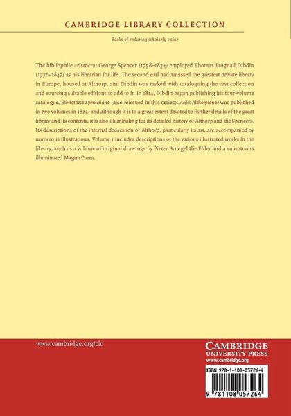 The bibliophile aristocrat George Spencer (1758-1834) employed Thomas Frognall Dibdin (1776-1847) as his librarian for life. The second earl had amassed the greatest private library in Europe, housed at Althorp, and Dibdin was tasked with cataloguing the vast collection and sourcing suitable editions to add to it. In 1814, Dibdin began publishing his four-volume catalogue, Bibliotheca Spenceriana (also reissued in this series). Aedes Althorpianae was published in two volumes in 1822, and although it is to a great extent devoted to further details of the great library and its contents, it is also illuminating for its detailed history of Althorp and the Spencers. Its descriptions of the internal decoration of Althorp, particularly its art, are accompanied by numerous illustrations. Volume 1 includes descriptions of the various illustrated works in the library, such as a volume of original drawings by Pieter Bruegel the Elder and a sumptuous illuminated Magna Carta.