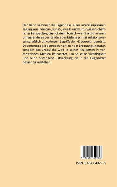 Der Band sammelt die Ergebnisse einer interdisziplinären Tagung aus literatur-, kunst-, musik- und kulturwissenschaftlicher Perspektive, die sich definitorisch wie inhaltlich um ein umfassenderes Verständnis des bislang primär religionswissenschaftlich diskutierten Begriffs der "Erbauung" bemüht. Das Interesse gilt demnach nicht nur der Erbauungsliteratur, sondern das Erbauliche wird in seiner Realisation in verschiedenen Medien beleuchtet, um so seine Vielfältigkeit und seine historische Entwicklung bis in die Gegenwart besser zu verstehen.