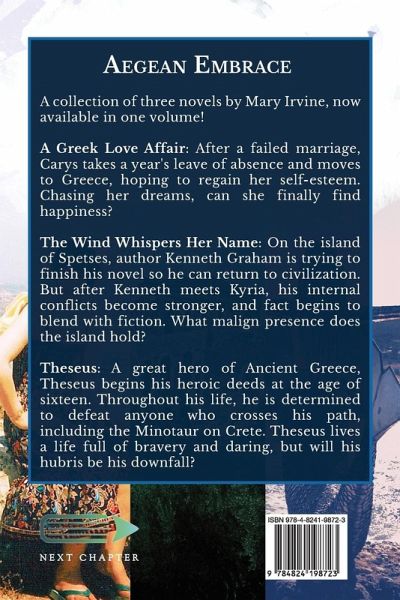 A collection of three novels by Mary Irvine, now available in one volume! A Greek Love Affair: After a failed marriage, Carys takes a year's leave of absence and moves to Greece, hoping to regain her self-esteem. Chasing her dreams, can she finally find happiness? The Wind Whispers Her Name: On the island of Spetses, author Kenneth Graham is trying to finish his novel so he can return to civilization. But after Kenneth meets Kyria, his internal conflicts become stronger, and fact begins to blend with fiction. What malign presence does the island hold? Theseus: A great hero of Ancient Greece, Theseus begins his heroic deeds at the age of sixteen. Throughout his life, he is determined to defeat anyone who crosses his path, including the Minotaur on Crete. Theseus lives a life full of bravery and daring, but will his hubris be his downfall?