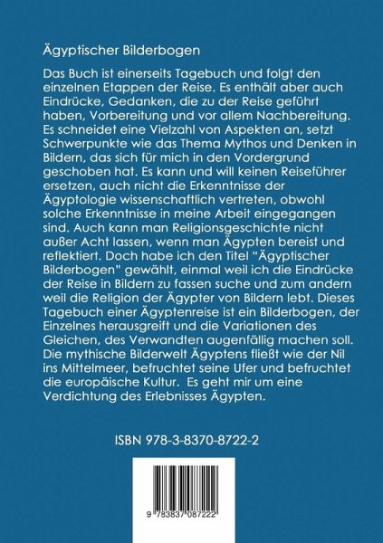 Das Buch ist einerseits Tagebuch und folgt den einzelnen Etappen der Reise. Es enthält aber auch Eindrücke, Gedanken, die zu der Reise geführt haben, Vorbereitung und vor allem Nachbereitung. Es schneidet eine Vielzahl von Aspekten an, setzt Schwerpunkte wie das Thema Mythos und Denken in Bildern, das sich für mich in den Vordergrund geschoben hat. Es kann und will keinen Reiseführer ersetzen, auch nicht die Erkenntnisse der Ägyptologie wissenschaftlich vertreten, obwohl solche Erkenntnisse in meine Arbeit eingegangen sind. Auch kann man Religionsgeschichte nicht außer Acht lassen, wenn man Ägypten bereist und reflektiert. Doch habe ich den Titel "Ägyptischer Bilderbogen" gewählt, einmal weil ich die Eindrücke der Reise in Bildern zu fassen suche und zum andern weil die Religion der Ägypter von Bildern lebt. Dieses Tagebuch einer Ägyptenreise ist ein Bilderbogen, der Einzelnes herausgreift und die Variationen des Gleichen, des Verwandten augenfällig machen soll. Die mythische Bilderwelt Ägyptens fließt wie der Nil ins Mittelmeer, befruchtet seine Ufer und befruchtet die europäische Kultur. Wie in meinen anderen Büchern, die Reisen zum Inhalt haben, geht es mir um eine Verdichtung des Erlebnisses Ägypten.