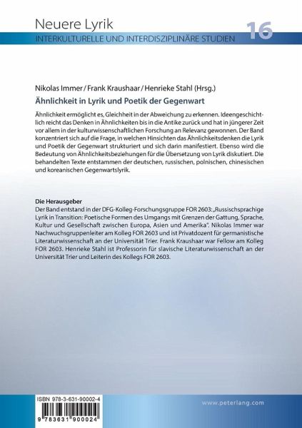 Ähnlichkeit ermöglicht es, Gleichheit in der Abweichung zu erkennen. Ideengeschichtlich reicht das Denken in Ähnlichkeiten bis in die Antike zurück und hat in jüngerer Zeit vor allem in der kulturwissenschaftlichen Forschung an Relevanz gewonnen. Der Band konzentriert sich auf die Frage, in welchen Hinsichten das Ähnlichkeitsdenken die Lyrik und Poetik der Gegenwart strukturiert und sich darin manifestiert. Ebenso wird die Bedeutung von Ähnlichkeitsbeziehungen für die Übersetzung von Lyrik diskutiert. Die behandelten Texte entstammen der deutschen, russischen, polnischen, chinesischen und koreanischen Gegenwartslyrik.