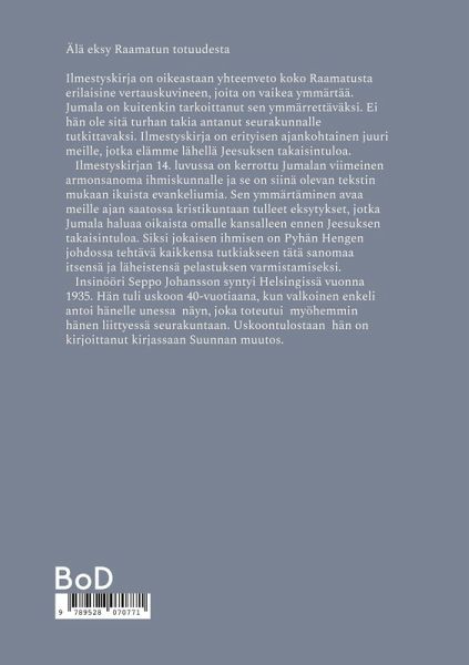 Ilmestyskirja on oikeastaan yhteenveto koko Raamatusta erilaisine vertauskuvineen, joita on vaikea ymmärtää. Jumala on kuitenkin tarkoittanut sen ymmärrettäväksi. Ei hän ole sitä turhan takia antanut seurakunnalle tutkittavaksi. Ilmestyskirja on erityisen ajankohtainen juuri meille, jotka elämme lähellä Kristuksen takaisintuloa. Ilmestyskirjan 14. luvussa on kerrottu Jumalan viimeinen armon sanoma ihmisille ennen Jeesuksen takaisintuloa ja se on siinä olevan tekstin mukaan ikuista evankeliumia. Sen ymmärtäminen avaa meille näin ollen kristikunnassa ajan saatossa tulleet eksytykset, jotka Jumala haluaa oikaista omalle kansalleen ennen Jeesuksen takaisintuloa. Siksi jokaisen ihmisen on oman etunsa vuoksi tehtävä kaikkensa tutkiakseen tätä sanomaa ja selvittääkseen nämä eksytykset oman pelastuksensa varmistamiseksi.