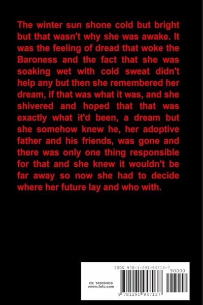 The winter sun shone cold but bright but that wasn't why she was awake. It was the feeling of dread that woke the Baroness and the fact that she was soaking wet with cold sweat didn't help any but then she remembered her dream, if that was what it was, and she shivered and hoped that that was exactly what it'd been, a dream but she somehow knew he, her adoptive father and his friends, was gone and there was only one thing responsible for that and she knew it wouldn't be far away so now she had to decide what her future would be and who with.