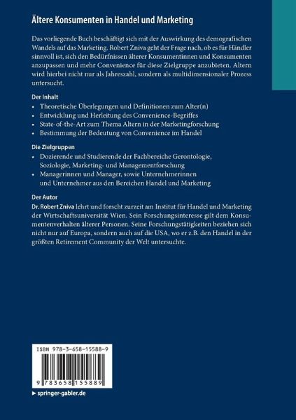 Das vorliegende Buch beschäftigt sich mit der Auswirkung des demografischen Wandels auf das Marketing. Robert Zniva geht der Frage nach, ob es für Händler sinnvoll ist, sich den Bedürfnissen älterer Konsumentinnen und Konsumenten anzupassen und mehr Convenience für diese Zielgruppe anzubieten. Altern wird hierbei nicht nur als Jahreszahl, sondern als multidimensionaler Prozess untersucht.