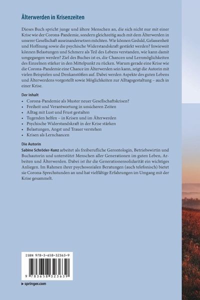 Dieses Buch spricht junge und ältere Menschen an, die sich nicht nur mit einer Krise wie der Corona-Pandemie, sondern gleichzeitig auch mit dem Älterwerden in unserer Gesellschaft auseinandersetzen möchten. Wie können Geduld, Gelassenheit und Hoffnung sowie die psychische Widerstandskraft gestärkt werden? Inwieweit können Belastungen und Schmerz als Teil des Lebens verstanden, wie kann damit umgegangen werden? Ziel des Buches ist es, die Chancen und Lernmöglichkeiten des Einzelnen stärker in den Mittelpunkt zu rücken. Warum gerade eine Krise wie die Corona-Pandemie eine Chance im Älterwerden sein kann, zeigt die Autorin mit vielen Beispielen und Denkanstößen auf. Dabei werden Aspekte des guten Lebens und Älterwerdens vorgestellt sowie Möglichkeiten zur Alltagsgestaltung - auch in einer Krise.