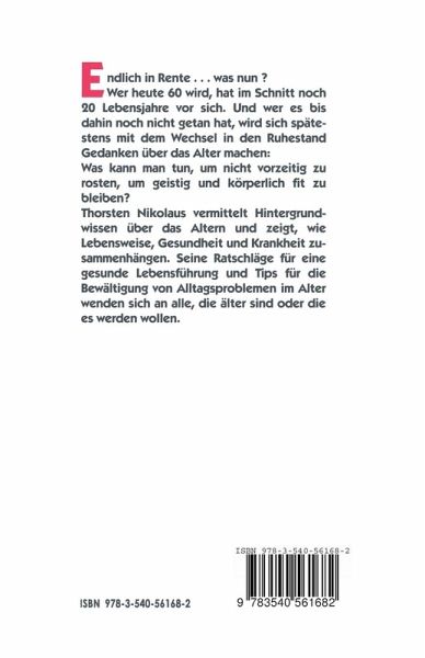 Was kann man tun, um nicht vorzeitig zu rosten, um geistig und körperlich fit zu bleiben? Wie lernt man, sein Leben an die nachlassende Leistungsfähigkeit anzupassen? Thorsten Nikolaus vermittelt Hintergrundwissen über das Altern und gibt Ratschläge für eine gesunde Lebensführung und Tips für die Bewältigung von Alltagsproblemen. Concise text: Was kann man tun, um auch im Alter geistig und körperlich fit zu bleiben? Thorsten Nikolaus vermittelt Hintergrundwissen über Altwerden und gesunde Lebensführung und gibt Tips für die Bewältigung von Alltagsproblemen.