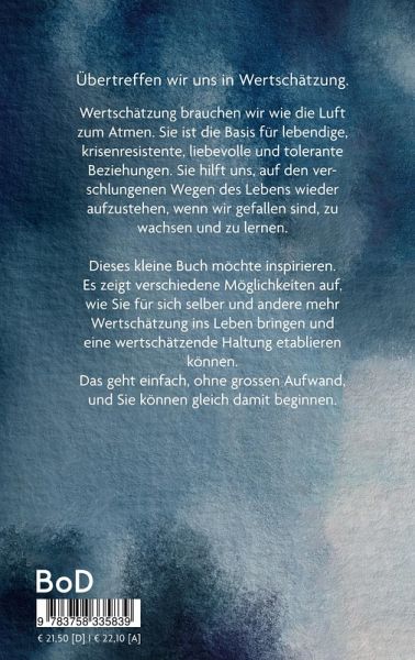 Wertschätzung brauchen wir wie die Luft zum Atmen. Sie ist die Basis für lebendige, krisenresistente, liebevolle und tolerante Beziehungen. Sie hilft uns, auf den verschlungenen Wegen des Lebens wieder aufzustehen, wenn wir gefallen sind, zu wachsen, zu lernen und auch unsere kleinen und grossen Fortschritte und Erfolge zu geniessen. Dieses kleine Buch möchte inspirieren. Es zeigt verschiedene Möglichkeiten auf, wie Sie für sich selber und andere mehr Wertschätzung ins Leben bringen und eine wertschätzende Haltung etablieren können. Das geht einfach, ohne grossen Aufwand, und Sie können gleich damit beginnen. Und das Faszinierende daran: Wertschätzung wirkt wie ein Bumerang. Wenn wir für andere da sind, ihre Einzigartigkeit wertschätzen und sie stärken, dann wachsen auch wir selber.