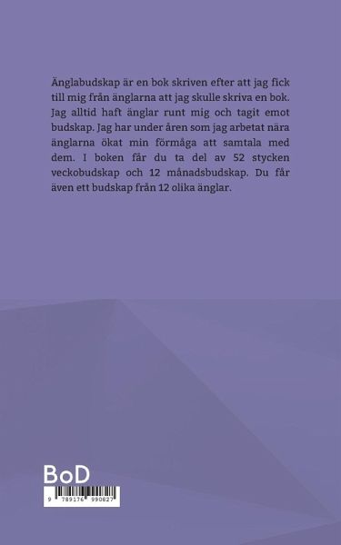 Änglabudskap är en bok skriven efter att jag fick till mig från änglarna att jag skulle skriva en bok. Jag alltid haft änglar runt mig och tagit emot budskap. Jag har under åren som jag arbetat nära änglarna ökat min förmåga att samtala med dem. I boken får du ta del av 52 stycken veckobudskap och 12 månadsbudskap. Du får även ett budskap från 12 olika änglar.