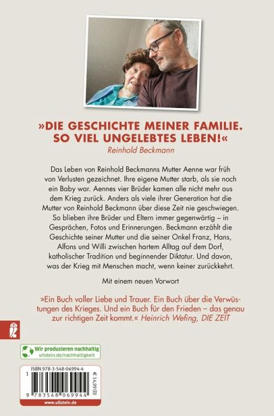 Das Leben von Reinhold Beckmanns Mutter Aenne war früh von Verlusten gezeichnet. Ihre Mutter starb, als Aenne noch ein Baby war. Vier Brüder hatte sie, alle im Krieg gefallen. Anders als viele ihrer Generation hat Aenne über diese Zeit nie geschwiegen. Ihre Brüder und Eltern blieben immer gegenwärtig, in Gesprächen, Fotos und Erinnerungen.