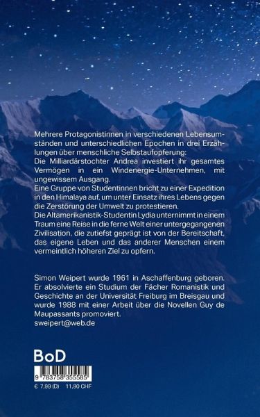 Die Milliardärstochter Andrea investiert ihr gesamtes Vermögen in ein Windenergie-Unternehmen, mit ungewissem Ausgang.Eine Gruppe von Studentinnen bricht zu einer Expedition in den Himalaya auf, um unter Einsatz ihres Lebens gegen die Zerstörung der Umwelt zu protestieren.Die Altamerikanistik-Studentin Lydia unternimmt in einem Traum eine Reise in die ferne Welt einer untergegangenen Zivilisation, die zutiefst geprägt ist von der Bereitschaft, das eigene Leben und das anderer Menschen einem vermeintlich höheren Ziel zu opfern.