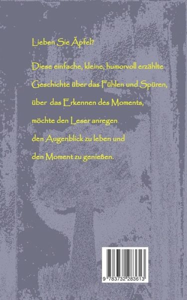 Lieben Sie Äpfel?Diese einfache, kleine, humorvoll erzählteGeschichte über das Fühlen und Spüren,über das Erkennen des Moments, möchte den Leser anregen den Augenblick zu leben undden Moment zu genießen.