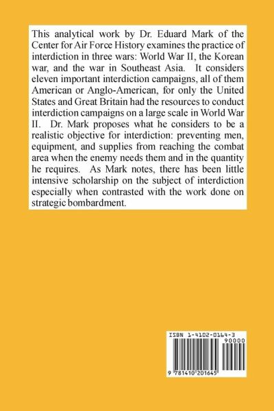 This analytical work by Dr. Eduard Mark of the Center for Air Force History examines the practice of interdiction in three wars: World War II, the Korean war, and the war in Southeast Asia. It considers eleven important interdiction campaigns, all of them American or Anglo-American, for only the United States and Great Britain had the resources to conduct interdiction campaigns on a large scale in World War II. Dr. Mark proposes what he considers to be a realistic objective for interdiction: preventing men, equipment, and supplies from reaching the combat area when the enemy needs them and in the quantity he requires. As Mark notes, there has been little intensive scholarship on the subject of interdiction especially when contrasted with the work done on strategic bombardment.