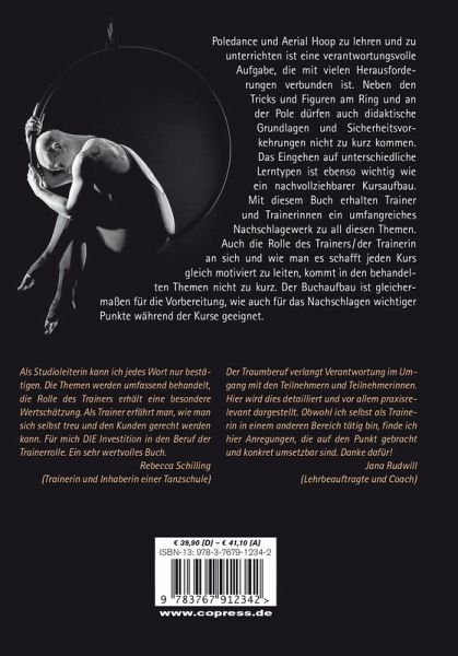 Poledance und Aerial Hoop zu lehren und zu unterrichten ist eine verantwortungsvolle Aufgabe, die mit vielen Herausforderungen verbunden ist. Beim Training der Tricks und Figuren im Ring und an der Pole dürfen auch didaktische Grundlagen und Sicherheitsvorkehrungen nicht zu kurz kommen. Das Eingehen auf unterschiedliche Lerntypen ist ebenso wichtig, wie ein nachvollziehbarer Kursaufbau. Mit diesem Buch erhalten Trainer und Trainerinnen ein umfangreiches Nachschlagewerk zu all diesen Themen. Auch die Rolle des Trainers / der Trainerin an sich und wie man es schafft jeden Kurs gleichermaßen motiviert zu leiten, kommt in den behandelten Themen nicht zu kurz. Somit eignet sich das Buch sowohl für die Vorbereitung von Unterrichtsinhalten, als auch für das schnelle Nachschlagen wichtiger Punkte wahrend der Kursstunden.