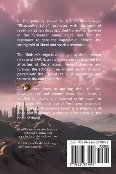 In "Rhapsody's Echo," the second volume of the Aeritheria series, a revelation propels Zane into the heart of the resistance: his mother, presumed dead, toils in the oppressive mining complex of Sheol. Fueled by this truth, Zane joins the fight to shatter the Ministry's iron grip over the citizens. The resistance is poised to broadcast "Rhapsody's Echo," a forbidden melody of uprising, throughout Aeritheria, coupled with the unveiling of the Reclamation horrors. This act of defiance is orchestrated to ignite a revolution, leveraging the stirring power of music and images to rally a silent majority into action. As DAWN, a cryptic program with untold potential, is set to disrupt the city's surveillance, the resistance faces the Ministry's ruthless crackdown. In a race against time and treachery, Zane must confront his own fears and the perilous journey to rescue his mother. Will this orchestrated crescendo of rebellion free Aeritheria, or will the dream of liberation crumble into silence? "Rhapsody's Echo" is a tale of courage and the resonance of collective hope-a clarion call to those who yearn for freedom in a world that has forgotten its power.