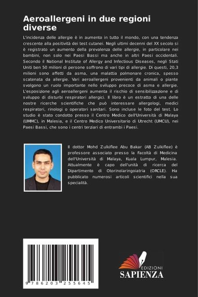 L'incidenza delle allergie è in aumento in tutto il mondo, con una tendenza crescente alla positività dei test cutanei. Negli ultimi decenni del XX secolo si è registrato un aumento della prevalenza delle allergie, in particolare nei bambini, non solo nei Paesi Bassi ma anche in altri Paesi occidentali. Secondo il National Institute of Allergy and Infectious Diseases, negli Stati Uniti ben 50 milioni di persone soffrono di vari tipi di allergie. Di questi, 20,3 milioni sono affetti da asma, una malattia polmonare cronica, spesso scatenata da allergie. Vari aeroallergeni provenienti da animali o piante svolgono un ruolo importante nello sviluppo precoce di asma e allergie. L'esposizione agli aeroallergeni aumenta il rischio di sensibilizzazione e di sviluppo di disturbi respiratori allergici. Il libro è un estratto di una delle nostre ricerche scientifiche che può interessare allergologi, medici respiratori, rinologi o operatori sanitari. Sono incluse le foto del test. Lo studio è stato condotto presso il Centro Medico dell'Università di Malaya (UMMC), in Malesia, e il Centro Medico Universitario di Utrecht (UMCU), nei Paesi Bassi, che sono i centri terziari di entrambi i Paesi.