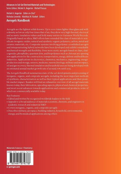 Aerogels are the lightest solids known. Up to 1000 times lighter than glass and with a density as low as only four times that of air, they show very high thermal, electrical and acoustic insulation values and hold many entries in Guinness World Records. Originally based on silica, R&D efforts have extended this class of materials to non-silicate inorganic oxides, natural and synthetic organic polymers, carbon, metal and ceramic materials, etc. Composite systems involving polymer-crosslinked aerogels and interpenetrating hybrid networks have been developed and exhibit remarkable mechanical strength and flexibility. Even more exotic aerogels based on clays, chalcogenides, phosphides, quantum dots, and biopolymers such as chitosan are opening new applications for the construction, transportation, energy, defense and healthcare industries. Applications in electronics, chemistry, mechanics, engineering, energy production and storage, sensors, medicine, nanotechnology, military and aerospace, oil and gas recovery, thermal insulation and household uses are being developed with an estimated annual market growth rate of around 70% until 2015.The Aerogels Handbook summarizes state-of-the-art developments and processing of inorganic, organic, and composite aerogels, including the most important methods of synthesis, characterization as well as their typical applications and their possible market impact. Readers will find an exhaustive overview of all aerogel materials known today, their fabrication, upscaling aspects, physical and chemical properties, and most recent advances towards applications and commercial products, some of which are commercially available today. Key Features: -Edited and written by recognized worldwide leaders in the field-Appeals to a broad audience of materials scientists, chemists, and engineers in academic research and industrial R&D-Covers inorganic, organic, and composite aerogels-Describes military, aerospace, building industry,household, environmental, energy, and biomedical applications among others