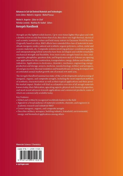 Aerogels are the lightest solids known. Up to 1000 times lighter than glass and with a density as low as only four times that of air, they show very high thermal, electrical and acoustic insulation values and hold many entries in Guinness World Records. Originally based on silica, R&D efforts have extended this class of materials to non-silicate inorganic oxides, natural and synthetic organic polymers, carbon, metal and ceramic materials, etc. Composite systems involving polymer-crosslinked aerogels and interpenetrating hybrid networks have been developed and exhibit remarkable mechanical strength and flexibility. Even more exotic aerogels based on clays, chalcogenides, phosphides, quantum dots, and biopolymers such as chitosan are opening new applications for the construction, transportation, energy, defense and healthcare industries. Applications in electronics, chemistry, mechanics, engineering, energy production and storage, sensors, medicine, nanotechnology, military and aerospace, oil and gas recovery, thermal insulation and household uses are being developed with an estimated annual market growth rate of around 70% until 2015.The Aerogels Handbook summarizes state-of-the-art developments and processing of inorganic, organic, and composite aerogels, including the most important methods of synthesis, characterization as well as their typical applications and their possible market impact. Readers will find an exhaustive overview of all aerogel materials known today, their fabrication, upscaling aspects, physical and chemical properties, and most recent advances towards applications and commercial products, some of which are commercially available today. Key Features: -Edited and written by recognized worldwide leaders in the field-Appeals to a broad audience of materials scientists, chemists, and engineers in academic research and industrial R&D-Covers inorganic, organic, and composite aerogels-Describes military, aerospace, building industry,household, environmental, energy, and biomedical applications among others