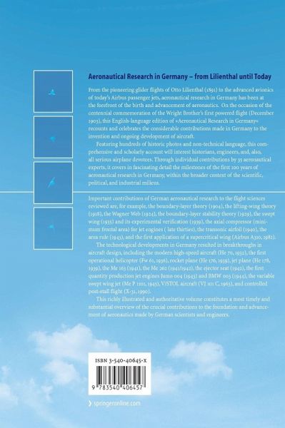 From the pioneering glider flights of Otto Lilienthal (1891) to the advanced avionics of today's Airbus passenger jets, aeronautical research in Germany has been at the forefront of the birth and advancement of aeronautics. On the occasion of the centennial commemoration of the Wright Brother's first powered flight (December 1903), this English-language edition of Aeronautical Research in Germany recounts and celebrates the considerable contributions made in Germany to the invention and ongoing development of aircraft.