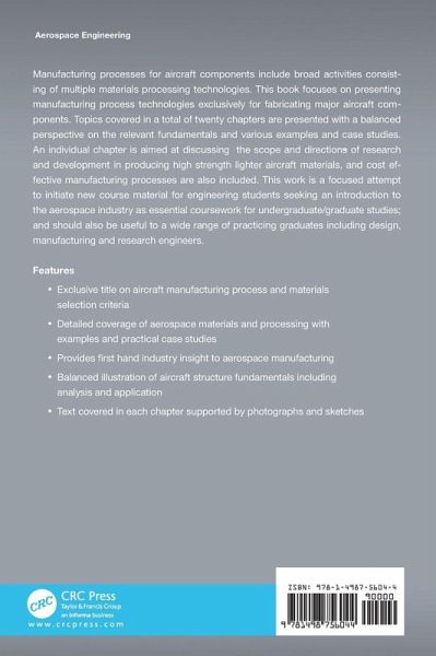 Manufacturing processes for aircraft components include broad activities consisting of multiple materials processing technologies. This book focuses on presenting manufacturing process technologies exclusively for fabricating major aircraft components. Topics covered in a total of twenty chapters are presented with a balanced perspective on the relevant fundamentals and various examples and case studies. An individual chapter is aimed at discussing the scope and direction of research and development in producing high strength lighter aircraft materials, and cost effective manufacturing processes are also included.…mehr