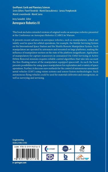 This book includes extended versions of original works on aerospace robotics presented at the Conference on Aerospace Robotics (CARO) in Warsaw. It presents recent advances in aerospace robotics, such as manipulators, which are widely used in space for orbital operations, for example, the Mobile Servicing System on the International Space Station and the Shuttle Remote Manipulator System. Such manipulators are operated by astronauts and mounted on large platforms, making the influence of manipulator motion on the state of the platform insignificant. Application of manipulators for capture maneuvers in unmanned On-Orbit Servicing or Active Debris Removal missions requires reliable control algorithms that take into account the free-floating nature of the manipulator-equipped spacecraft. As such the book presents possibilities for using space manipulators for exploration and a variety of space operations. Further, it discusses new methods for the control ofautonomous unmanned aerialvehicles (UAV) using vision systems and sensor fusion methodologies. Such autonomous flying vehicles could be used for materials deliveries and emergencies, as well as surveying and servicing.