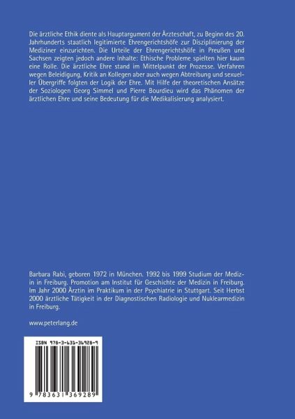 Die ärztliche Ethik diente als Hauptargument der Ärzteschaft, zu Beginn des 20. Jahrhunderts staatlich legitimierte Ehrengerichtshöfe zur Disziplinierung der Mediziner einzurichten. Die Urteile der Ehrengerichtshöfe in Preußen und Sachsen zeigten jedoch andere Inhalte: Ethische Probleme spielten hier kaum eine Rolle. Die ärztliche Ehre stand im Mittelpunkt der Prozesse. Verfahren wegen Beleidigung, Kritik an Kollegen aber auch wegen Abtreibung und sexueller Übergriffe folgten der Logik der Ehre. Mit Hilfe der theoretischen Ansätze der Soziologen Georg Simmel und Pierre Bourdieu wird das Phänomen der ärztlichen Ehre und seine Bedeutung für die Medikalisierung analysiert.