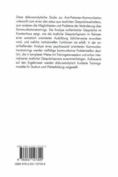 Diese diskursanalytische Studie zur Arzt-Patienten-Kommunikation untersucht zum einen den status quo ärztlichen Gesprächsverhaltens, zum anderen die Möglichkeiten und Probleme der Veränderung über Kommunikationstrainings. Die Analyse authentischer Gespräche im Krankenhaus zeigt, wie die ärztliche Gesprächspraxis im Rahmen einer somatisch orientierten Ausbildung üblicherweise erworben wird und welche institutionellen Funktionen sie erfüllt. In der anschließenden Analyse eines psychosozial orientierten Kommunikationstrainings werden vielfältige kommunikative Problemstellen deutlich, die in komplexer Weise mit Trainingskonzeption und schon internalisierter ärztlicher Gesprächspraxis zusammenhängen. Aufbauend auf den Ergebnissen werden diskursanalytisch fundierte Trainingsmodelle für Studium und Weiterbildung vorgestellt.