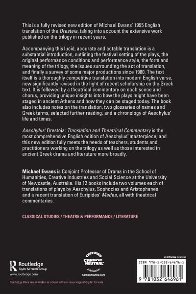 Accompanying this lucid, accurate and actable translation is a substantial introduction, outlining the festival setting of the plays, the original performance conditions and performance style, the form and meaning of the trilogy, the issues surrounding the act of translation, and finally a survey of some major productions since 1980. The text itself is a thoroughly competitive translation into modern English verse, now significantly revised in the light of recent scholarship on the text. It is followed by a theatrical commentary on each scene and chorus, providing unique insights into how the plays might have been staged in ancient Athens and how they can be staged today. The book also includes notes on the translation, two glossaries of names and Greek terms, selected further reading, and a chronology of Aeschylus' life and times.
