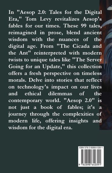 "Aesop 2.0: Tales for the Digital Era" brings to life the timeless fables of Aesop, reimagined in captivating prose to resonate with our contemporary, digital-centric world. In this innovative collection, author Tom Levy bridges the gap between ancient wisdom and modern technology, weaving together 99 tales that explore the intersection of timeless morals and current digital phenomena. From the familiar narrative of "The Cicada and the Ant" to the imaginative "Reality and the Glitch," these tales, skillfully crafted in prose, offer a unique blend of time-honored lessons and modern-day challenges. Characters like electric scooters, antivirus software, and even figures like Elon Musk find their place in these narratives, reflecting the diversity and dynamism of our current age. Each story in "Aesop 2.0" is a testament to the enduring power of fables, retooled for today's readership. These tales delve into themes such as technology's impact on society, the fusion of the organic with the electronic, and the timeless human condition. Perfect for lovers of classic fables and modern storytelling alike, "Aesop 2.0" invites readers of all ages to discover a world where ancient parables and the digital domain intertwine. With a blend of humor, insight, and imagination, this collection is a must-read for anyone seeking wisdom in our rapidly evolving world. Join us in "Aesop 2.0: Tales for the Digital Era," and experience the timeless magic of Aesop's fables reinterpreted for the digital generation.