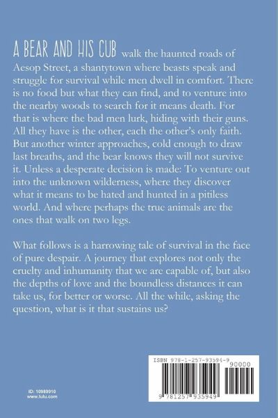A bear and his cub walk the haunted roads of Aesop Street, a shantytown where beasts speak and struggle for survival while men dwell in comfort. There is no food but what they can find, and to venture into the nearby woods to search for it means death. For that is where the bad men lurk, hiding with their guns. All they have is the other, each the other's only faith. But another winter approaches, cold enough to draw last breaths, and the bear knows they will not survive it. Unless a desperate decision is made: To venture out into the unknown wilderness, where they discover what it means to be hated and hunted in a pitiless world. And where perhaps the true animals are the ones that walk on two legs.