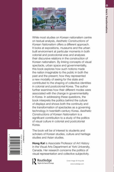 While most studies on Korean nationalism centre on textual analysis, Aesthetic Constructions of Korean Nationalism offers a different approach. It looks at expositions, museums and the urban built environment at particular moments in both colonial and postcolonial eras and analyses their discursive relations in the construction of Korean nationalism. By linking concepts of visual spectacle, urban space and governmentality, this book explores how such notions made the nation imaginable to the public in both the past and the present; how they represented a new modality of seeing for the state and contributed to the shaping of collective identities in colonial and postcolonial Korea. The author further examines how their different modes were associated with the change in governmentality in Korea. In addressing these questions, the book interprets the politics behind the culture of displays and shows both the continuity and the transformation of spectacles as a governing technology in twentieth-century Korea. Aesthetic Constructions of Korean Nationalism is a significant contribution to a study of the politics of visual culture in colonial and postcolonial Korea. The book will be of interest to students and scholars of Korean Studies, Culture and Heritage Studies and Asian Studies.