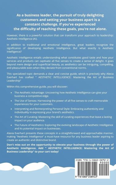As a business leader, the pursuit of truly delighting customers and setting your business apart is a constant challenge. If you've experienced the difficulty of reaching these goals, you're not alone. However, there is a powerful solution that can transform your approach to leadership: Aesthetic Intelligence (AI). In addition to traditional and emotional intelligence, great leaders recognize the significance of developing Aesthetic Intelligence. But what exactly is Aesthetic Intelligence? Aesthetic Intelligence entails understanding what constitutes good taste and how your services and products can captivate all five senses to create a sense of delight. It goes beyond mere design and superficial beauty, as aesthetics can be intriguing, compelling, and pleasurable even when they deviate from conventional norms. This specialized topic demands a clear and concise guide, which is precisely why Alexia Everhart has crafted " AESTHETIC INTELLIGENCE: Mastering the Art of Business Leadership" Within this comprehensive guide, you will discover: The Aesthetic Advantage: Uncovering how Aesthetic Intelligence can give your business a competitive edge. The Use of Senses: Harnessing the power of all five senses to craft memorable experiences for your customers. Interpreting and Reinterpreting Personal Style: Embracing authenticity and individuality in expressing your brand's aesthetics. The Art of Curating: Mastering the skill of curating experiences that leave a lasting impact on your audience. The Future of Aesthetics: Exploring the evolving landscape of Aesthetic Intelligence and its potential impact on businesses. Alexia Everhart presents these concepts in a straightforward and approachable manner, making "Aesthetic Intelligence" a must-have resource for any business leader aspiring to create an authentic and distinctive brand. Don't miss out on the opportunity to elevate your business through the power of Aesthetic Intelligence. Add " AESTHETIC INTELLIGENCE: Mastering the Art of Business Leadership" to your cart today!