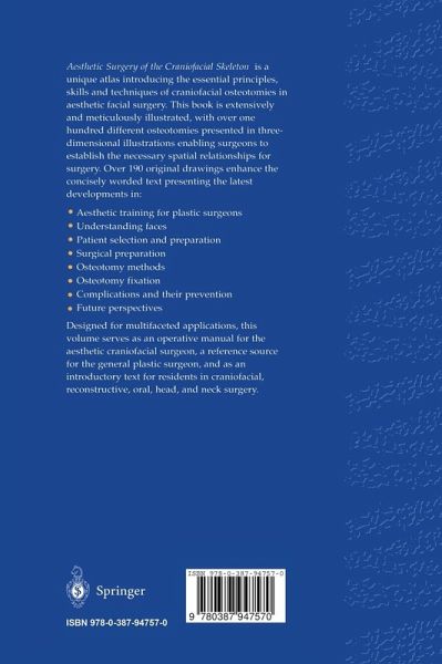 Aesthetic Surgery of the Craniofacial Skeleton is a unique atlas presenting specific procedures for aesthetic craniofacial surgery in a comprehensive and easily understandable style. With over 190 fine line drawings specially created for this volume, this book will have multifaceted applications; as an operation manual for the aesthetic craniofacial surgeon, a reference source for the general plastic surgeon, and as an introductory text for residents in craniofacial, reconstructive, oral, head and neck surgery. It includes close to 100 osteotomy methods and imperative information on patient selection, preoperative procedures, complications and implants.