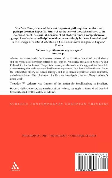 Theodor Adorno (1903-69) was undoubtedly the foremost thinker of the Frankfurt School, the influential group of German thinkers that fled to the US in the 1930s, including such thinkers as Herbert Marcuse and Max Horkheimer. His work has proved enormously influential in sociology, philosophy and cultural theory. Aesthetic Theory is Adorno's posthumous magnum opus and the culmination of a lifetime's investigation. Analysing the sublime, the ugly and the beautiful, Adorno shows how such concepts frame and distil human experience and that it is human experience that ultimately underlies aesthetics. In Adorno's formulation 'art is the sedimented history of human misery'. Edited by Gretel Adorno and Rolf Tiedeman Translated by Robert Hullot-Kentor.