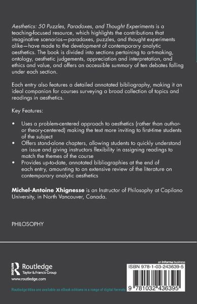 Aesthetics: 50 Puzzles, Paradoxes, and Thought Experiments is a teaching-focused resource, which highlights the contributions that imaginative scenarios-paradoxes, puzzles, and thought experiments alike-have made to the development of contemporary analytic aesthetics. The book is divided into sections pertaining to art-making, ontology, aesthetic judgements, appreciation and interpretation, and ethics and value, and offers an accessible summary of ten debates falling under each section.