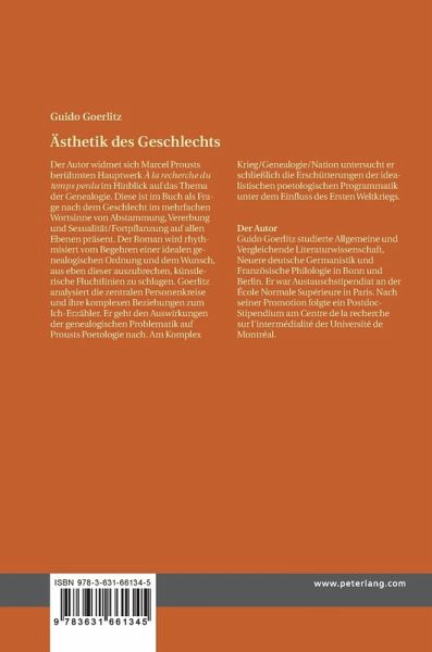 Der Autor widmet sich Marcel Prousts berühmten Hauptwerk À la recherche du temps perdu im Hinblick auf das Thema der Genealogie. Diese ist im Buch als Frage nach dem Geschlecht im mehrfachen Wortsinne von Abstammung, Vererbung und Sexualität/Fortpflanzung auf allen Ebenen präsent. Der Roman wird rhythmisiert vom Begehren einer idealen genealogischen Ordnung und dem Wunsch, aus eben dieser auszubrechen, künstlerische Fluchtlinien zu schlagen. Goerlitz analysiert die zentralen Personenkreise und ihre komplexen Beziehungen zum Ich-Erzähler. Er geht den Auswirkungen der genealogischen Problematik auf Prousts Poetologie nach. Am Komplex Krieg/Genealogie/Nation untersucht er schließlich die Erschütterungen der idealistischen poetologischen Programmatik unter dem Einfluss des Ersten Weltkriegs.