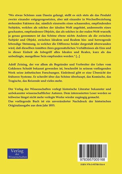 Adolf Zeising, der vor allem als Begründer und Verbreiter der Lehre vom Goldenen Schnitt bekannt geworden ist, beschreibt in seinem vorliegenden Werk seine ästhetischen Forschungen. Einleitend gibter eine Übersicht der früheren Systeme. Er schreibt über das Schöne überhaupt, das Komische, das Tragische, das Reizende und vieles mehr.
