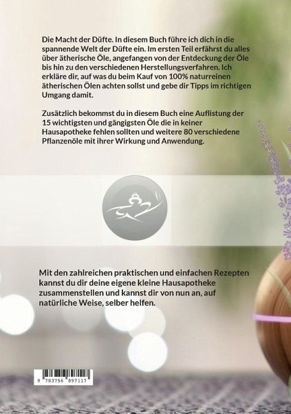 Ätherische Öle für Einsteiger. Die Macht der Düfte. In diesem Buch führe ich dich in die spannende Welt der Ätherischen Ölen und Aromatherapie ein. Im ersten Teil erfährst du alles über ätherische Öle, angefangen von der Entdeckung der Öle bis hin zu den verschiedenen Herstellungsverfahren. Ich erkläre dir, auf was du beim Kauf von 100% naturreinen ätherischen Ölen achten sollst und gebe dir Tipps im richtigen Umgang damit.Zusätzlich bekommst du in diesem Buch eine Auflistung der 15 wichtigsten und gängigsten Öle die in keiner Hausapotheke fehlen sollten und weitere 80 verschiedene Pflanzenöle, als Pflanzenlexikon mit Farbbildern, mit ihrer Wirkung und Anwendung.Mit den zahlreichen praktischen und einfachen Rezepten, u.a. Depressionen lindern, besser einschlafen, Immunsystem stärken, kannst du dir deine eigene kleine Hausapotheke zusammenstellen und kannst dir von nun an, auf natürliche Weise, selber helfen.