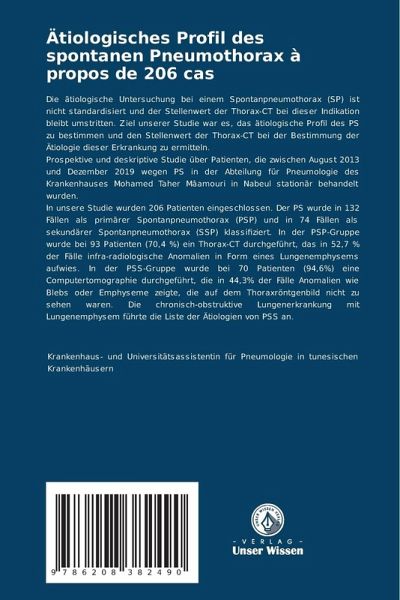 Die ätiologische Untersuchung bei einem Spontanpneumothorax (SP) ist nicht standardisiert und der Stellenwert der Thorax-CT bei dieser Indikation bleibt umstritten. Ziel unserer Studie war es, das ätiologische Profil des PS zu bestimmen und den Stellenwert der Thorax-CT bei der Bestimmung der Ätiologie dieser Erkrankung zu ermitteln.Prospektive und deskriptive Studie über Patienten, die zwischen August 2013 und Dezember 2019 wegen PS in der Abteilung für Pneumologie des Krankenhauses Mohamed Taher Mâamouri in Nabeul stationär behandelt wurden.In unsere Studie wurden 206 Patienten eingeschlossen. Der PS wurde in 132 Fällen als primärer Spontanpneumothorax (PSP) und in 74 Fällen als sekundärer Spontanpneumothorax (SSP) klassifiziert. In der PSP-Gruppe wurde bei 93 Patienten (70,4 %) ein Thorax-CT durchgeführt, das in 52,7 % der Fälle infra-radiologische Anomalien in Form eines Lungenemphysems aufwies. In der PSS-Gruppe wurde bei 70 Patienten (94,6%) eine Computertomographie durchgeführt, die in 44,3% der Fälle Anomalien wie Blebs oder Emphyseme zeigte, die auf dem Thoraxröntgenbild nicht zu sehen waren. Die chronisch-obstruktive Lungenerkrankung mit Lungenemphysem führte die Liste der Ätiologien von PSS an.