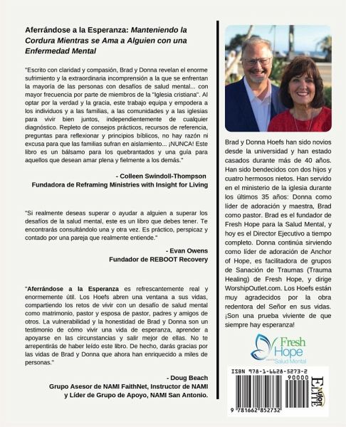 'Aferrándose a la Esperanza' es un libro sobre cómo encontrar esperanza en las circunstancias que nos rodean cuando parece que no la hay. Aunque registra muchos ejemplos de todos los ámbitos de la vida, se trata principalmente de la lucha que el pastor Brad Hoefs y su esposa, Donna, han afrontado y superado durante los últimos veinticinco años, desde que a él se le diagnosticó por primera vez con trastorno bipolar. Brad y Donna Hoefs han sido novios desde la universidad y han estado casados durante más de 40 años. Han sido bendecidos con dos hijos y cuatro hermosos nietos. Han servido en el ministerio de la iglesia durante los últimos 35 años: Donna como líder de adoración y maestra, Brad como pastor. Brad es el fundador de Fresh Hope para la Salud Mental, y hoy es el director ejecutivo a tiempo completo. Donna continúa sirviendo como líder de adoración de Anchor of Hope, es facilitadora de grupos de Sanidad de Trauma (Trauma Healing) de Fresh Hope, y dirige WorshipOutlet.com. Los Hoefs están muy agradecidos por la obra redentora del Señor en sus vidas. ¡Ellos son una prueba viviente de que siempre hay esperanza!