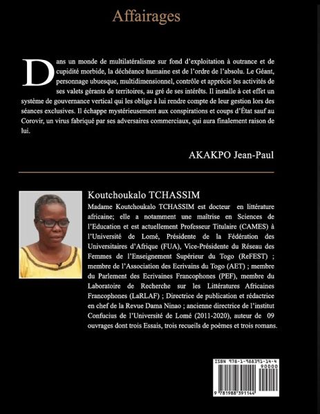 Dans un monde de multilatéralisme sur fond d'exploitation à outrance e de cupidité morbide, la déchéance humaine est de l'ordre de l'absolu. Le Géant, personnage ubuesque, multidimensionnel, contrôle et apprécie les activités de ses valets gérants de territoires, au gré de ses intérêts. Il installe à cet effet un système de gouvernance vertical qui les oblige à lui rendre compte de leur gestion lors ses séances exclusives. Il échappe mystérieusement aux conspirations et coups d'État sauf au Corovir, un virus fabriqué par ses adversaires commerciaux, qui aura finalement raison de lui. In the multilateral world of extreme exploitation and morbid greed, the downfall of humans is inevitable. A ubiquitous multidimensional Giant controls and manages the activities of his valets who govern territories in accordance with his interests. To do so, he creates a vertical administrative system that requires them to report to him during exclusive sessions. He escapes mysteriously conspiracies and coups but falls victim of Corovir, a virus created by his commercial opponents. This virus will finally get the better of him. Koutchoukalo Tchassim est docteur en littérature africaine ; elle est actuellement Professeur Titulaire (CAMES) à l'Université de Lomé, Présidente de la Fédération des Universitaires d'Afrique (FUA), Vice-P¿ésidente du Réseau des Femmes de I'Enseignement Supérieur du Togo (ReFEST) ; membre de l'Association des Ecrivains du Togo (AET) ; membre du Parlement des Ecrivaines Francophones (PEF), membre du Laboratoire de Recherche sur les Littératures Africaines Francophones (LaRLAF) ; Directrice de publication et rédactrice en chef de la Revue Dama Ninao ; auteure de neuf ouvrages dont trois Essais, trois recueils de ¿¿èmes et trois romans. Koutchoukalo Tchassim has a PhD in African literature. Currently, she is a CAMES full professor at the University of Lomé, the president of Fédération des Universitaires d'Afrique (FUA) and vice-president of Réseau des Femmes de I'Enseignement Supérieur du Togo (ReFEST), as well as a member of Togolese Writers' Association (AET), Parlement des Ecrivaines Francophones (PEF) and Laboratoire de Recherche sur les Literatures Africaines Francophones (LaRLAF). Tchassim is the director and editor-in-chief of Dama Niao journal. She is the author of nine books, including three books of essays, three collections of poetry and three novels.